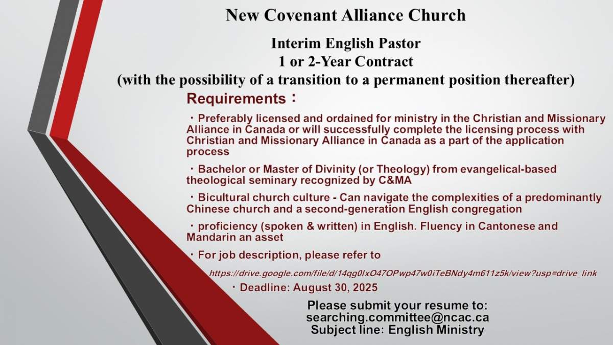 Toronto Posted 9 個月 ago Website New Covenant Alliance Church To apply for this job email your details to searching.committee@ncac.ca 分享這個帖子 Share on FacebookShare on Facebook Share on XShare on X Share on WhatsAppShare on WhatsApp